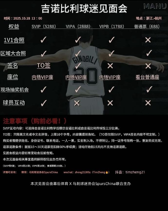 吉諾比利在杭州的球迷見面會,SVIP票價(jià)為5288元,VIPA為2888元,VIPB為1788元,普通票為688元。