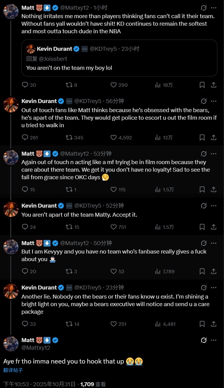 10月31日訊 今日杜蘭特繼續(xù)在社媒和網(wǎng)友對線。