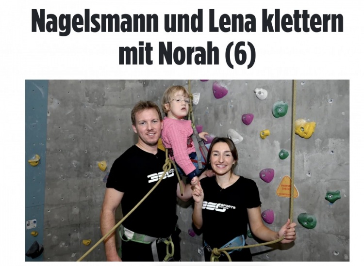 納格爾斯曼在場地里與這對由于一種罕見的基因缺陷而在身體上受限的兄妹一同攀向高處。通過這一行動,納格爾斯曼和女友支持了RTL基金會旗下“我們幫助孩子協(xié)會”以及RTL電視臺的募捐馬拉松活動。