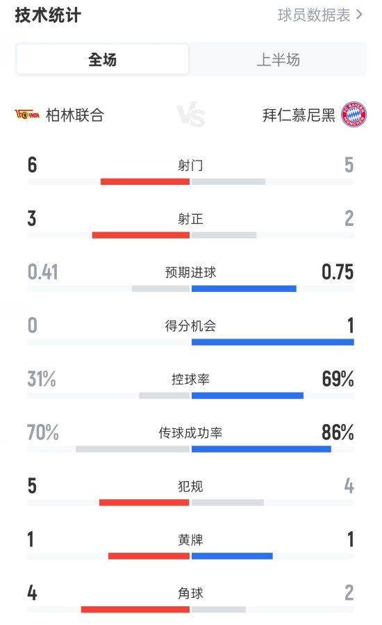 11月8日訊 2025-26賽季德甲聯(lián)賽第 10輪,柏林聯(lián)合主場迎戰(zhàn)拜仁,半場戰(zhàn)罷兩隊暫 1-1戰(zhàn)平。