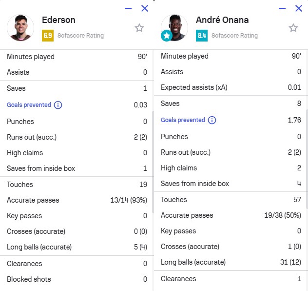 本場(chǎng)比賽,埃德森1次撲救(1次撲救禁區(qū)內(nèi)的射門)、2次成功出擊,19次觸球,5次長(zhǎng)傳4次成功,獲評(píng)6.9分。奧納納8次撲救(4次撲救禁區(qū)內(nèi)的射門)、2次成功出擊、2次高球攔截,57次觸球,31次長(zhǎng)傳12次成功,1次解圍,獲評(píng)8.4分全場(chǎng)最高。