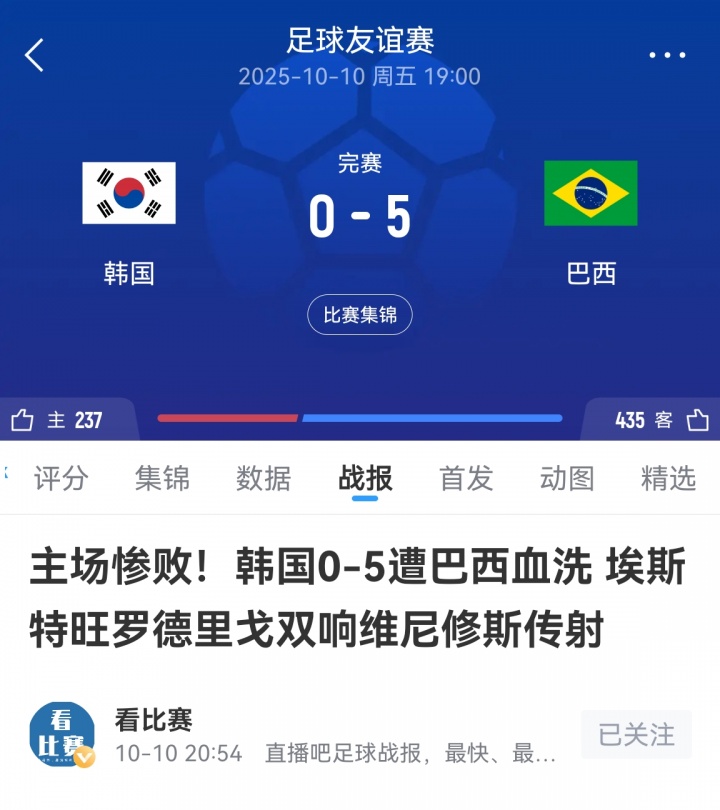4天前在韓國,巴西隊5-0橫掃韓國隊。