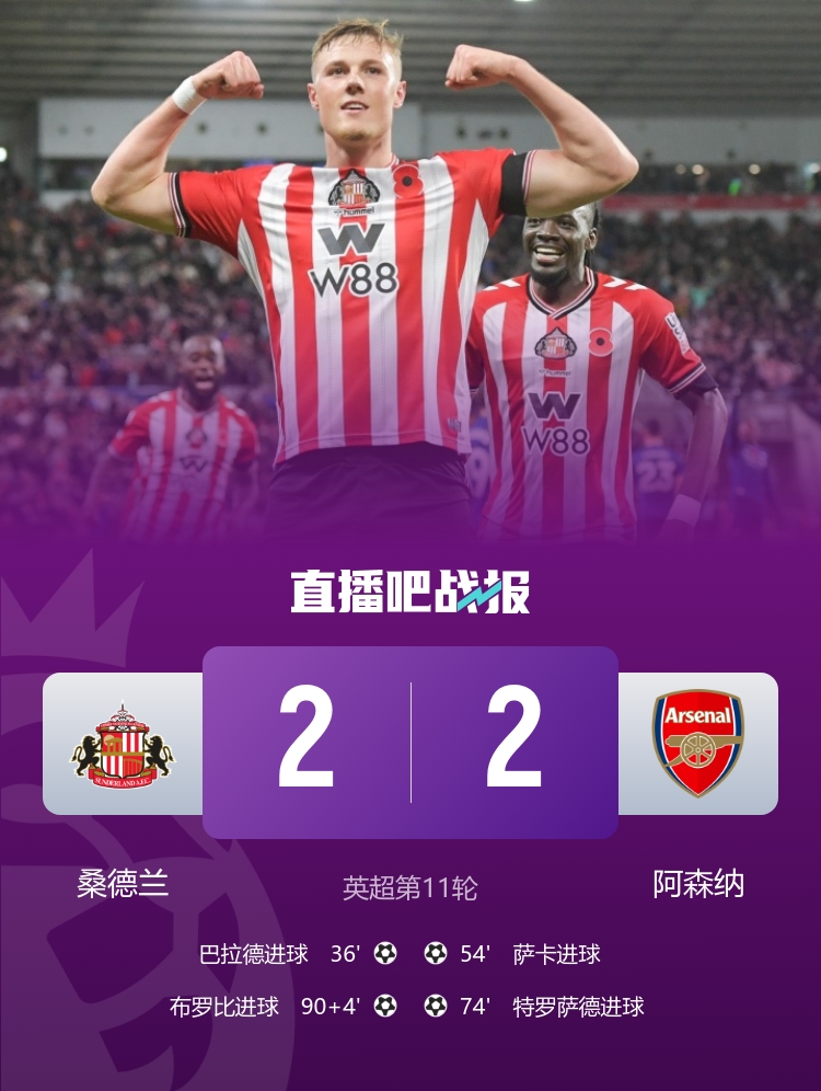 第90+4分鐘,桑德蘭挑傳到禁區(qū)內(nèi),巴拉德頭球擺渡,拉亞出擊沒能將球沒收,布羅比包抄凌空側(cè)勾破門,2-2!↓
